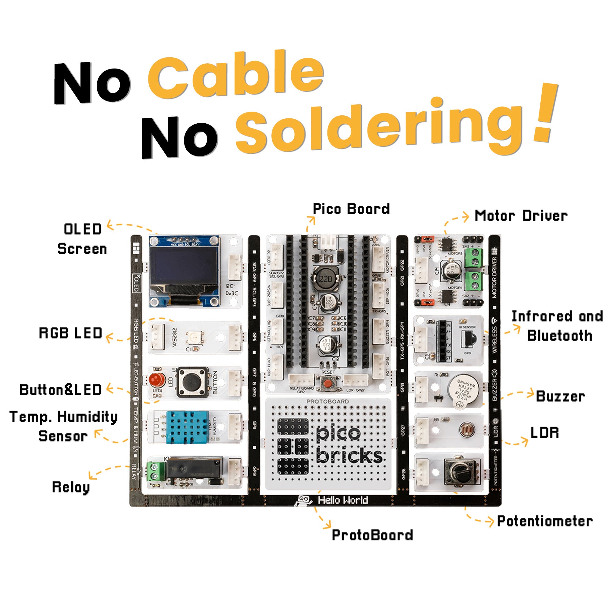 Picobricks mainboard has thought of everything. Unlike other kits, it supports all kinds of connections.
